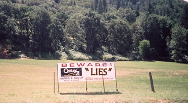 Gold Hill, OR – Out of sheer frustration with Century 21 (Harris/Taylor Real Estate) not taking responsibility for damaging her, Linda Acosta recently placed the above pictured sign on her property off I-5 just south of Rogue River, Oregon. The sign was only up for a short time when calls came into the Observer office from passers-by informing us that someone had vandalized the sign. Someone obviously loyal to Century 21 Real Estate had cut the name “Century 21” completely out during the night. Irate over the vandalism, Linda went directly to her sign shop and had another sign made. This time she placed it on a trailer with lights to make it visible at night.