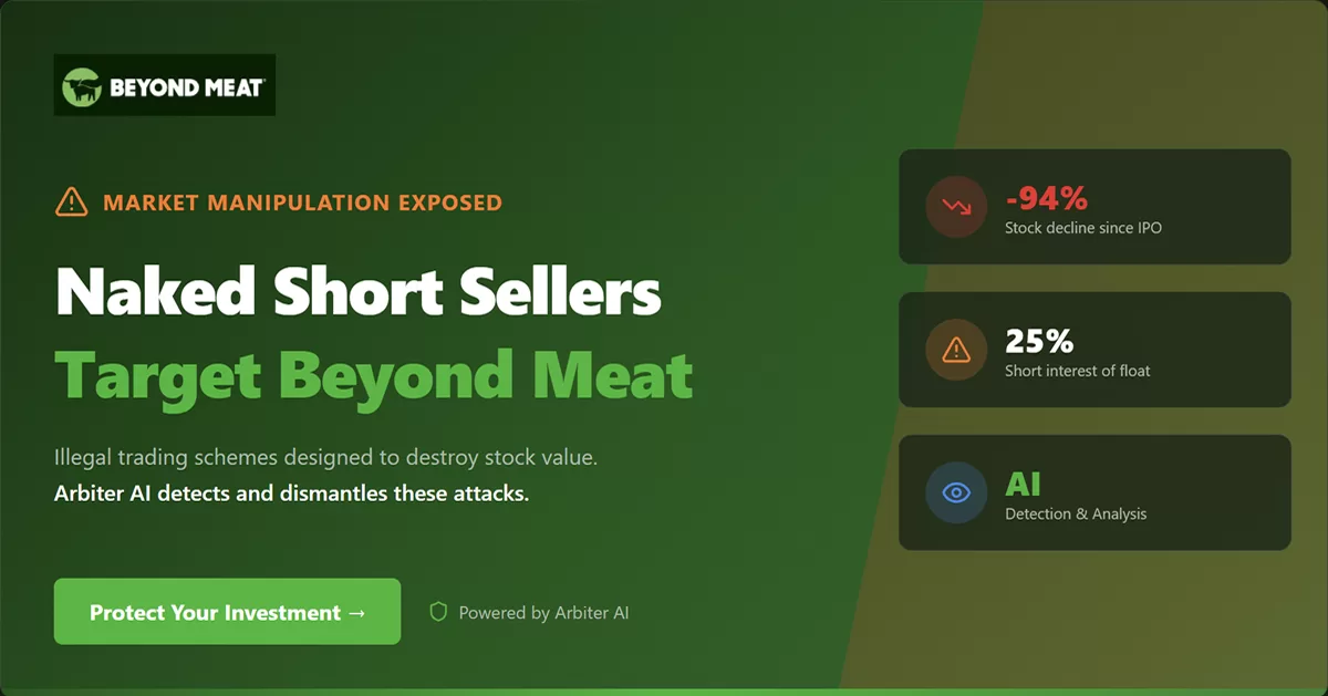 If you’re a Beyond Meat (BYND) company exec, shareholder, or just someone tired of watching your stock get hammered by shady tactics, this is for you. USO Arbiter AI is like a super-smart watchdog built by US~Observer to sniff out and fight back against naked short selling—the sneaky practice where big players flood the market with fake shares they don’t actually own, tanking prices and stealing value. Drawing from decades of real investigations, Arbiter uses AI smarts to spot these tricks early, gather rock-solid proof, and push regulators to step up. It’s not magic; it’s precise tools that give you the edge you didn’t even know you needed.